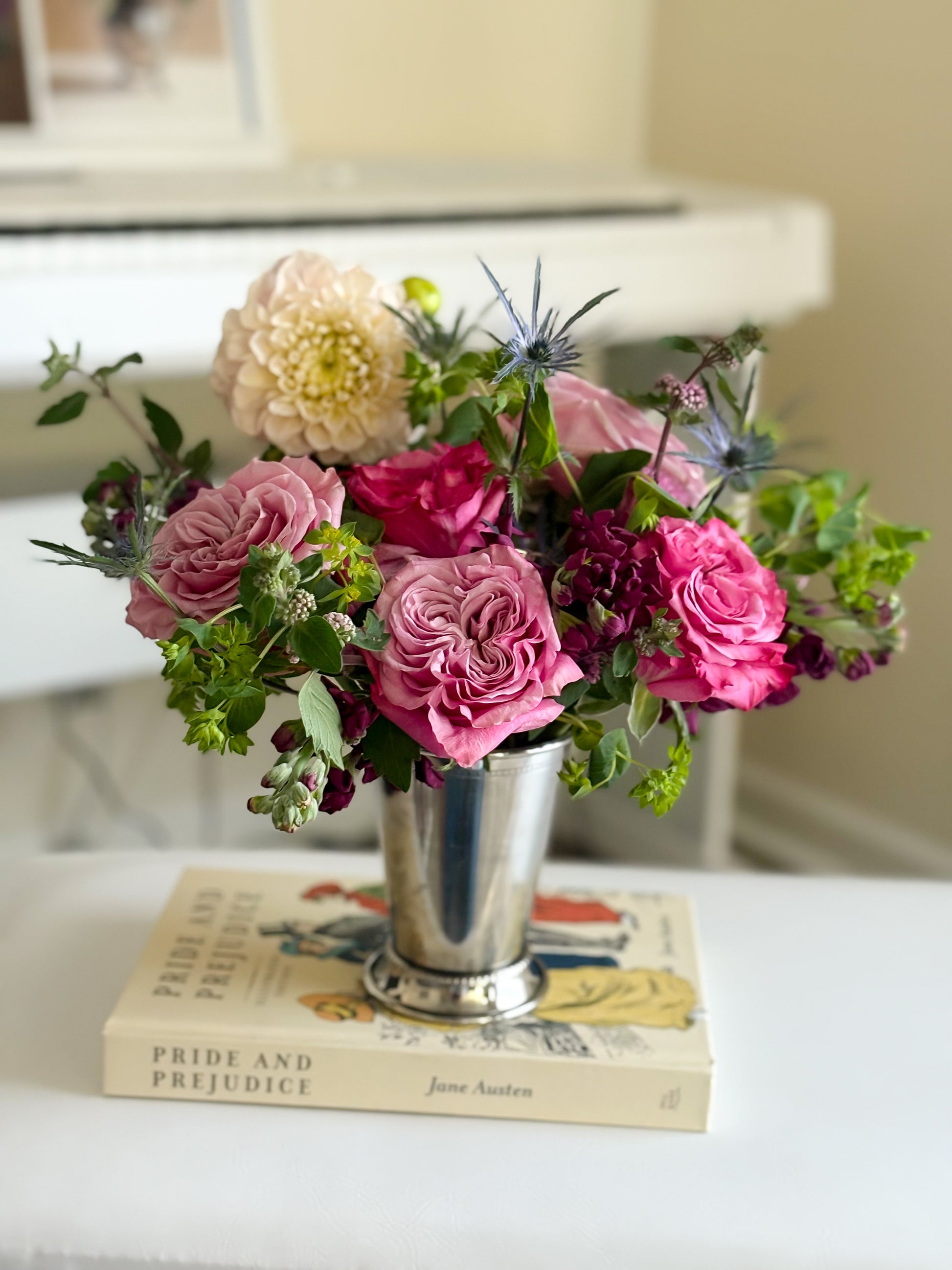 Instantly transport yourself to the English countryside with this Autumn Romance Collection. Grab a Jane Austen novel to read by the fire as you imagine jumping into the pages and roaming through nature and all its beauty. This collection features soft, feminine garden roses in mauve and lilac tones juxtaposed with a more masculine navy thistle and berries, creating the perfect love story.