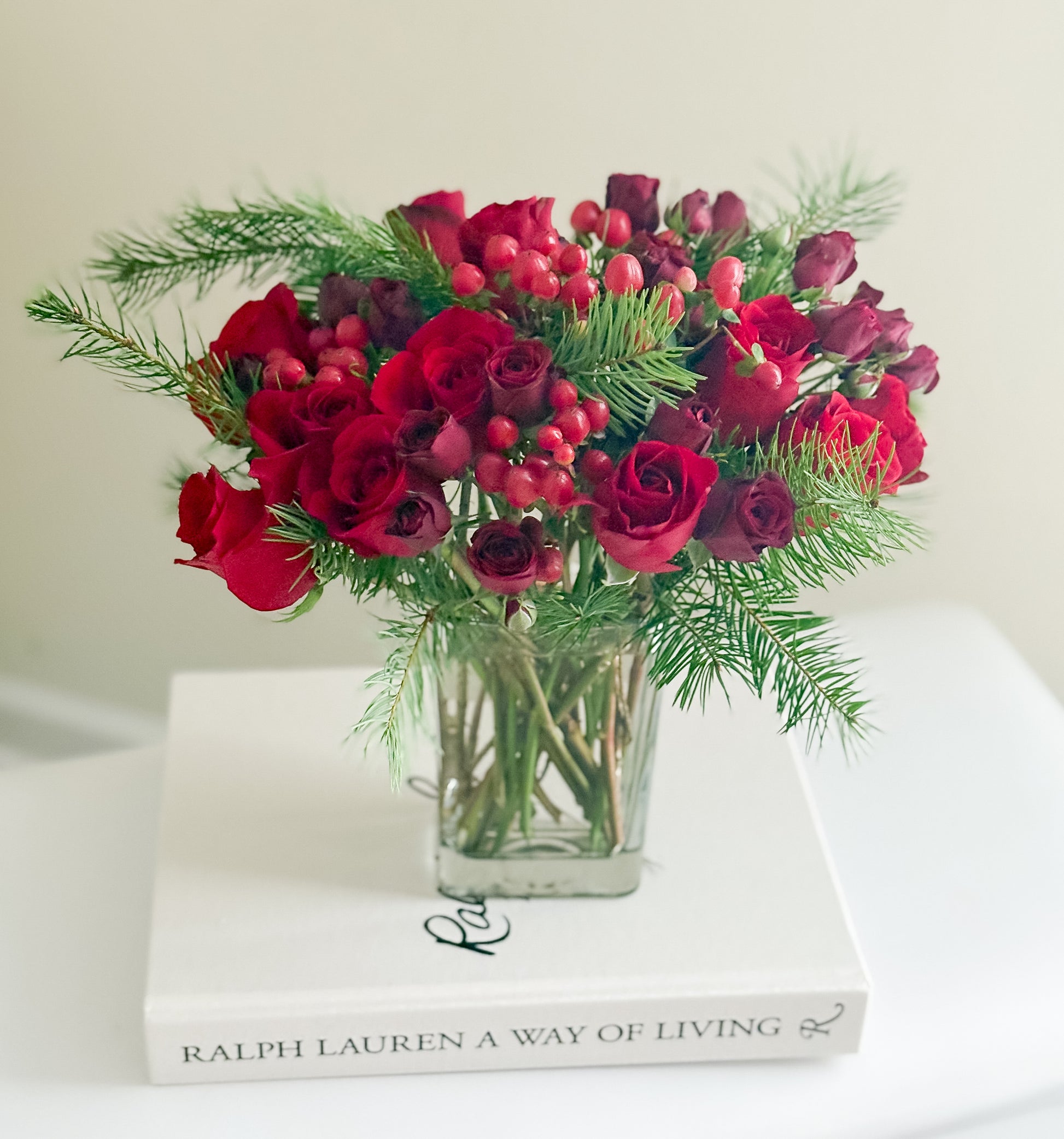 Is there anything more quintessentially than velvet red roses mixed with berries and pine? Celebrate the seasons beauty with this timeless composition perfect for gifting or your holiday table.