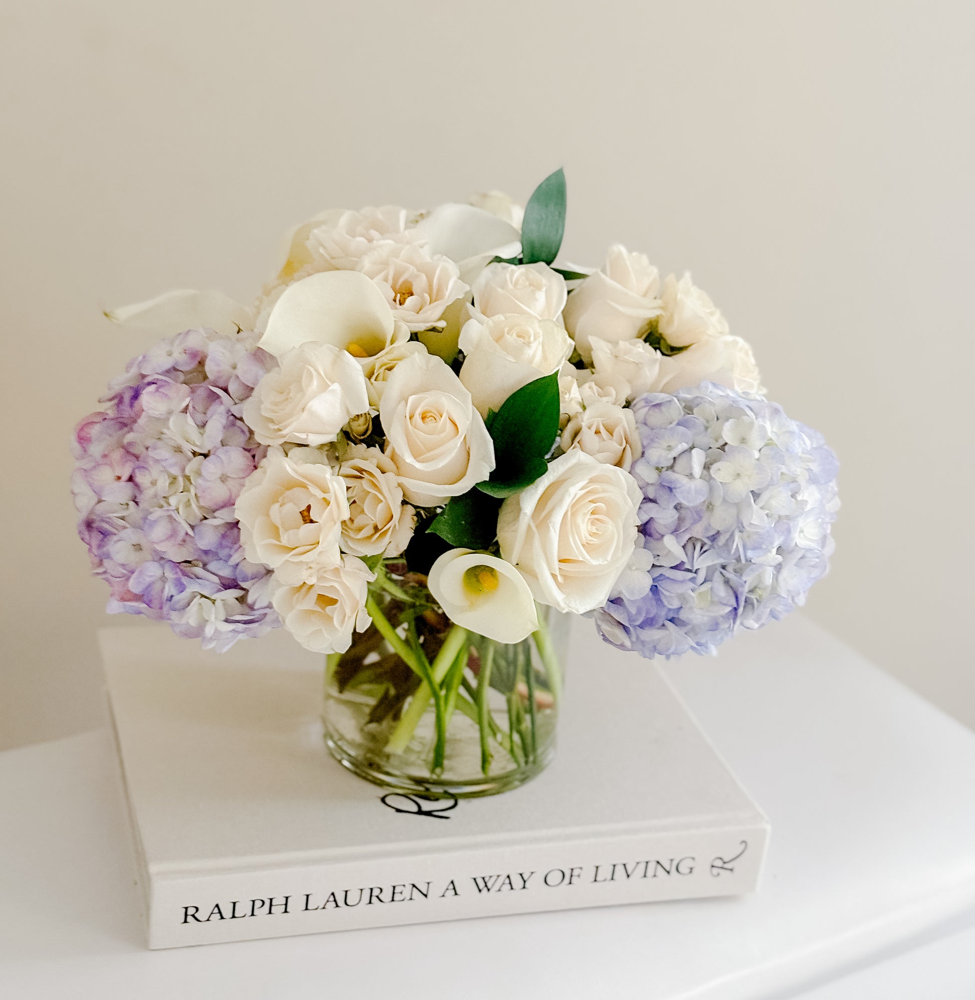 Inspired by the winter sky on a cold snowy day, this collection is the epitome of timeless style. Beautiful light blue hydrangeas coupled with cream roses and calla lilies creates a classic style perfect for gifting or entertaining.